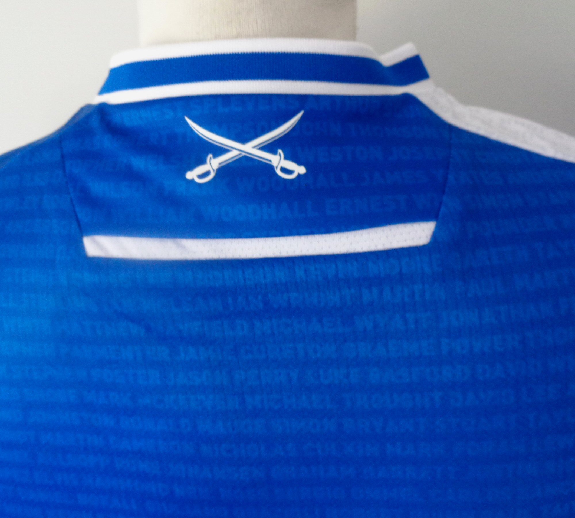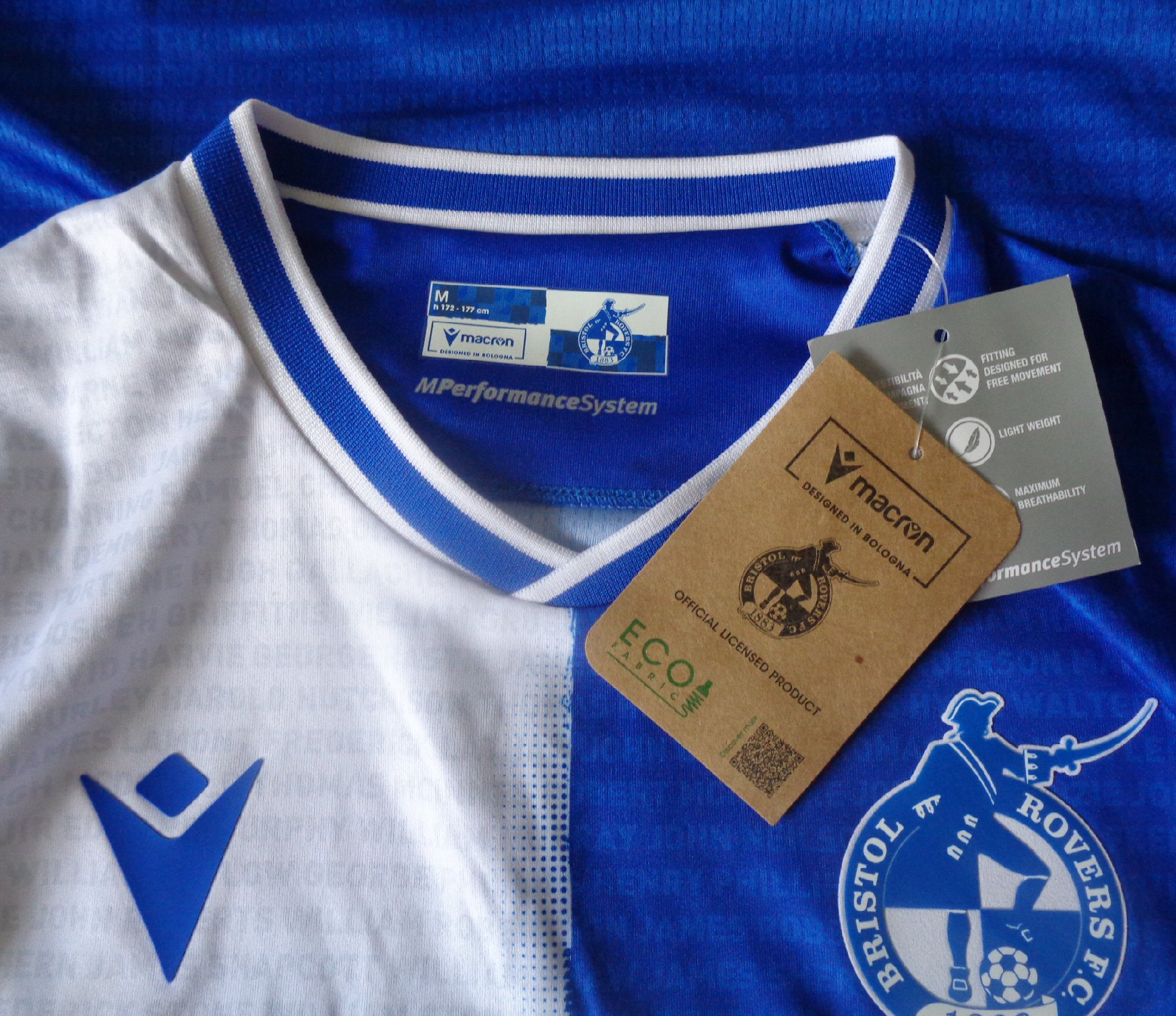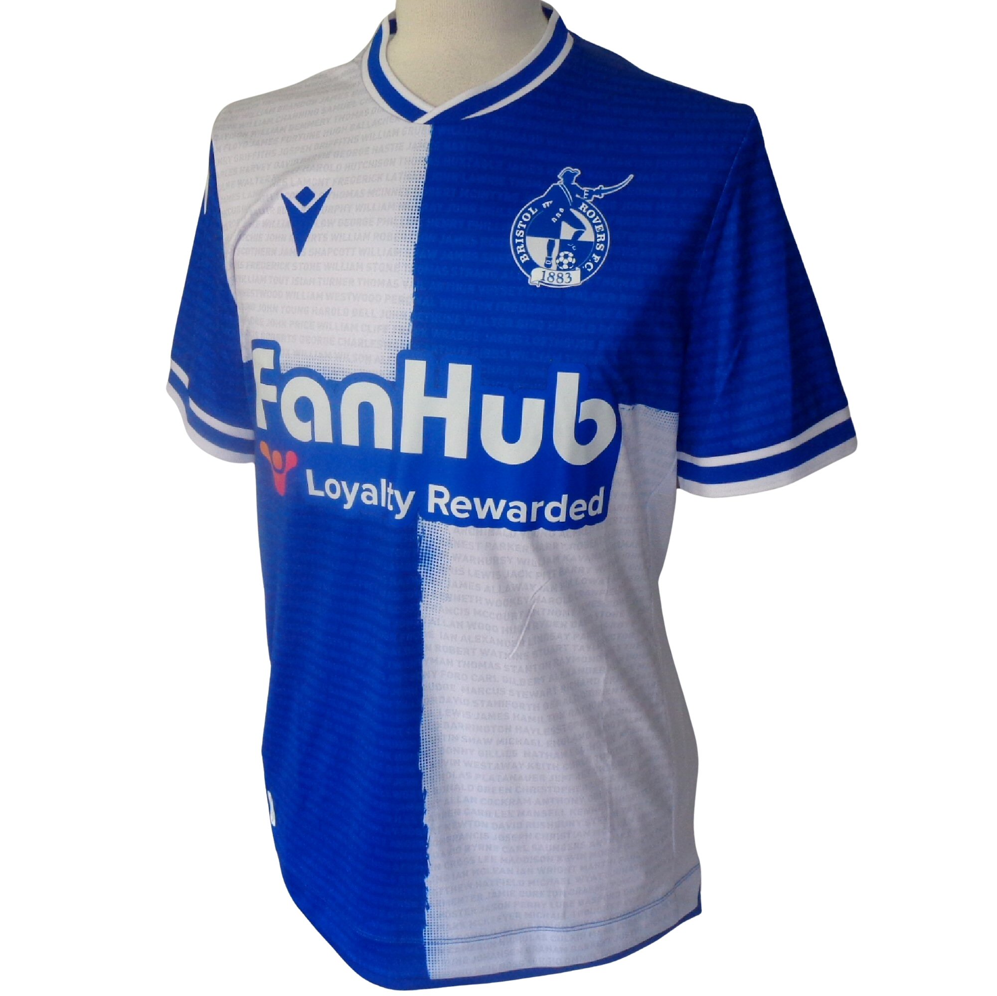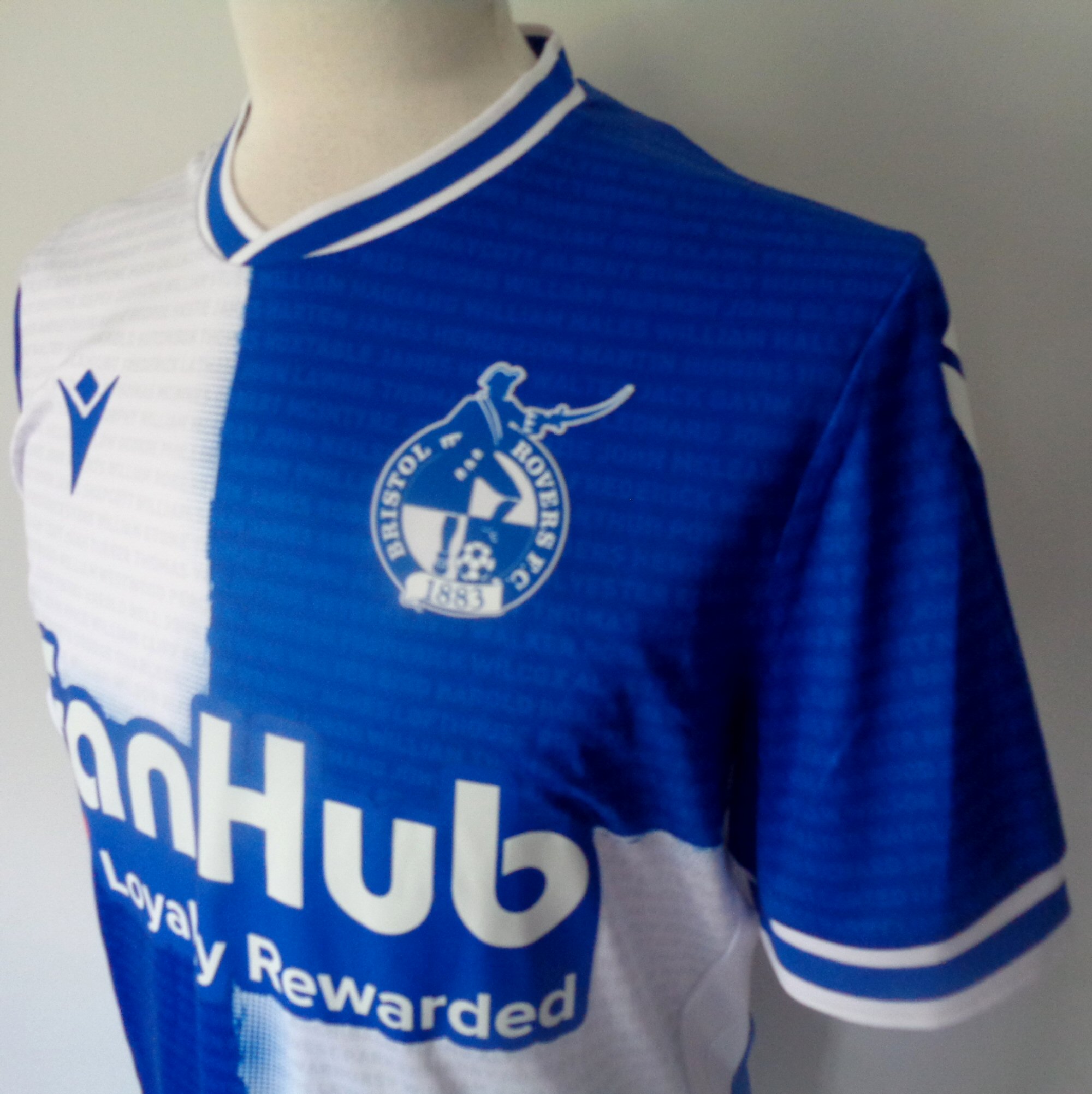 Official Macron home shirt for English club Bristol Rovers, which features the names of hundreds of players who have played for the club over the years. New with tags.
